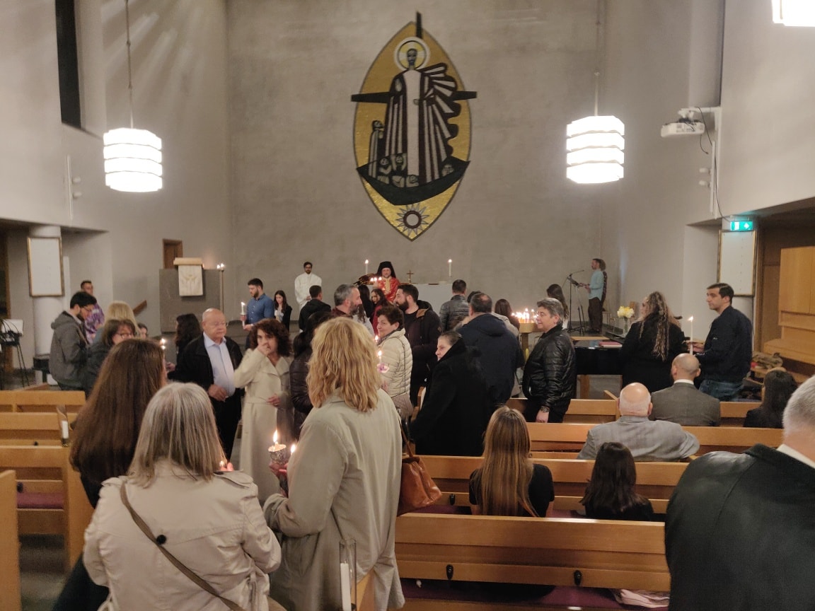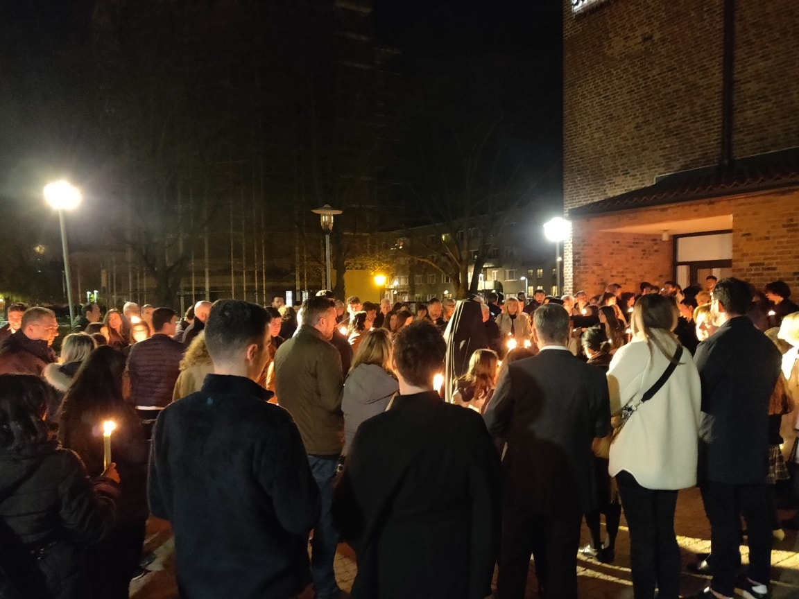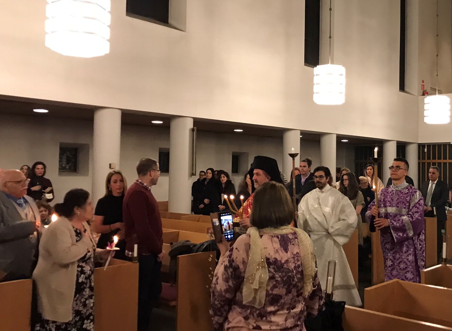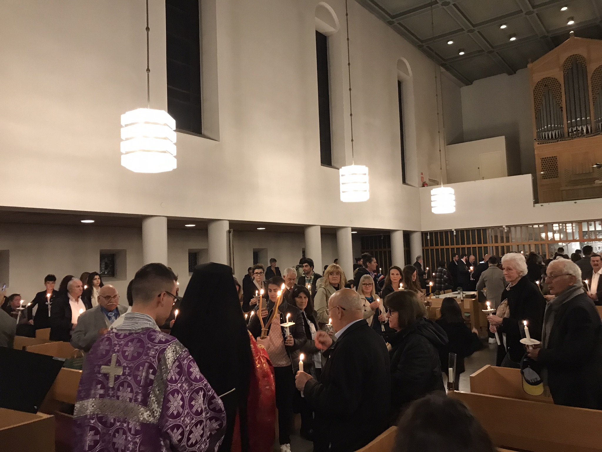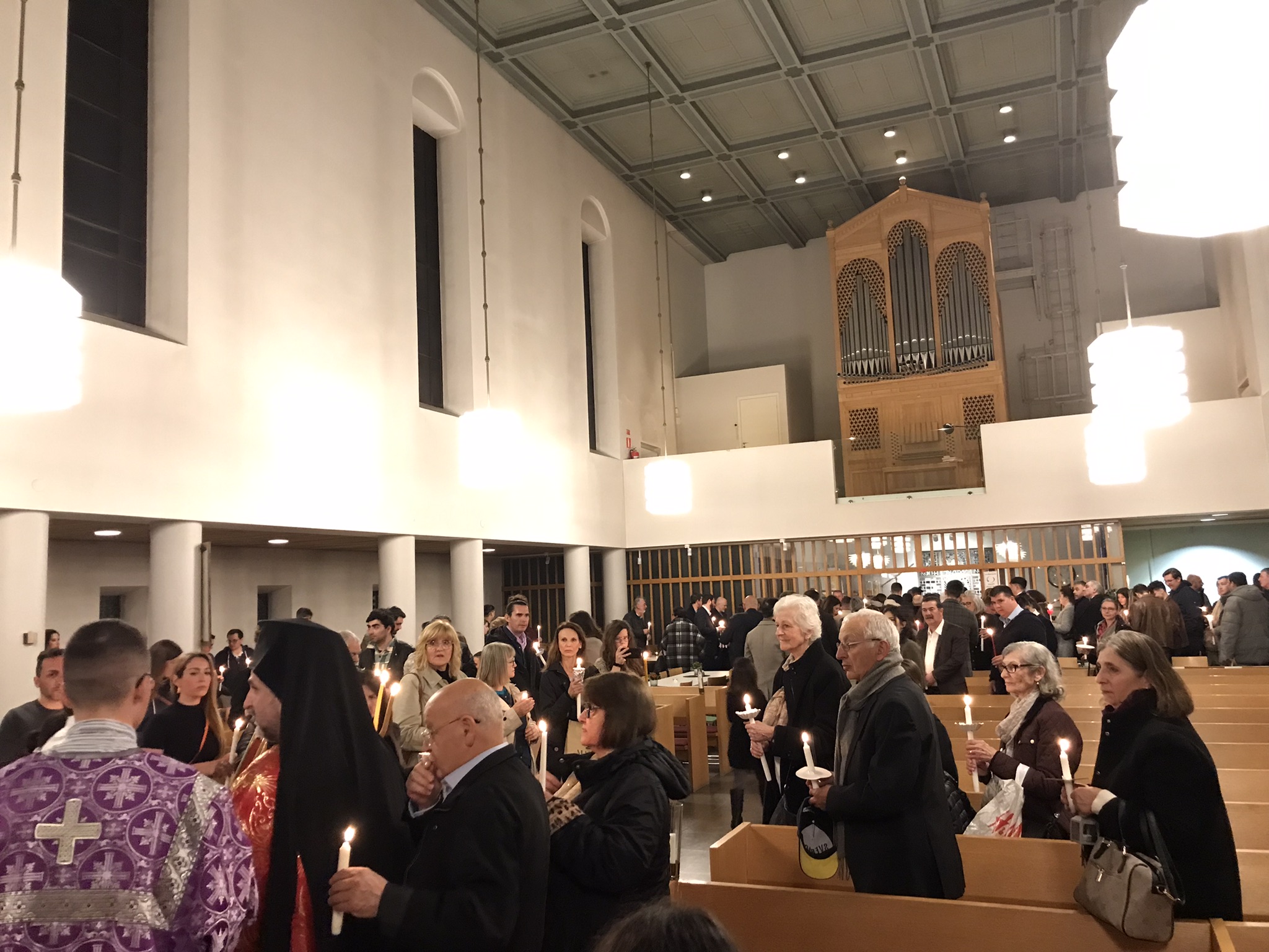 Αναστάσεως ηµέρα λαµπρυνθώµεν Λαοί, Πάσχα Κυρίου, Πάσχα εκ γαρ θανάτου προς ζωήν, και εκ γης προς ουρανόν, Χριστός ο Θεός, ηµάς διεβίβασεν, επινίκιον άδοντας.