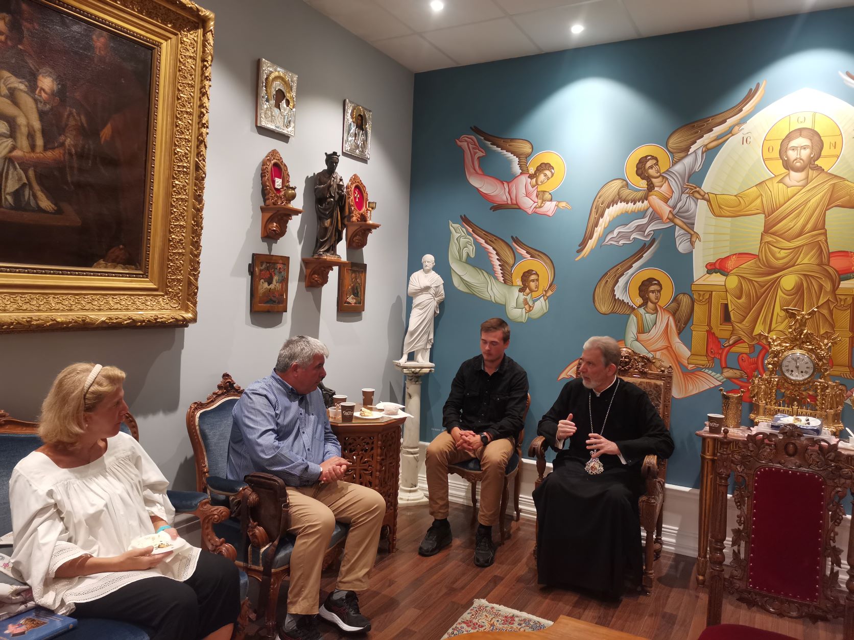 Στην συνέχεια, στο μουσείο Ελληνοχριστιανικής Κληρονομιάς, η κ. Κυριακή Καραπαναγιωτίδου προσέφερε γλυκίσματα στους φιλοξενούμενους, ενώ αργότερα, στον ίδιο χώρο, παρετέθη στον Διάκονο και σε μέλη της νεολαίας, γεύμα, από την Πρόεδρο της Φιλοπτώχου Αδελφότητος του ναού, Εριτ. κ. Φωτεινή Μπατσέλα.