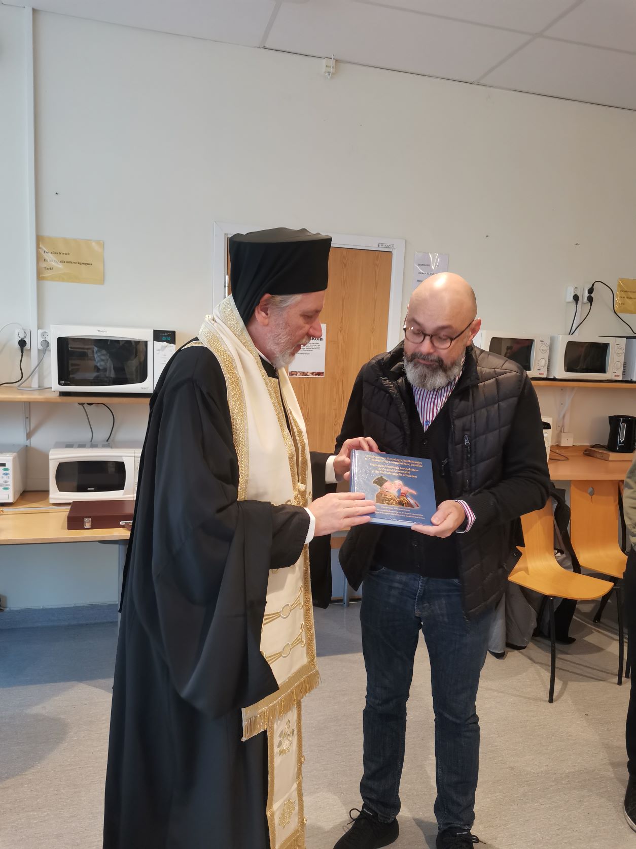 Ο Σεβασμιώτατος, αφού μίλησε στους μαθητές για την ευαγγελική περικοπή που αναφέρεται στην παρουσία του 12ετούς Ιησού εν μέσω των διδασκάλων του Ιουδαϊκού Νόμου και τη σπουδαιότητα του εκκλησιασμού, προσέφερε στον πρόεδρο του σχολείου Ελλογ. κ. Δημήτρη Σιώτη τον αναμνηστικό τόμο της Πατριαρχικής Επισκέψεως του 2019, στον οποίο περιλαμβάνεται και η επίσκεψη της Α. Θ. Παναγιότητος, του Οικουμενικού Πατριάρχου κ. Βαρθολομαίου στο ως άνω σχολείο.