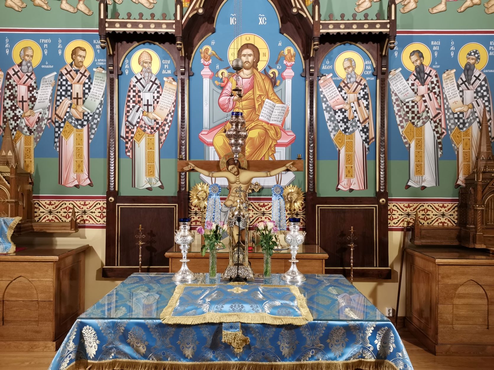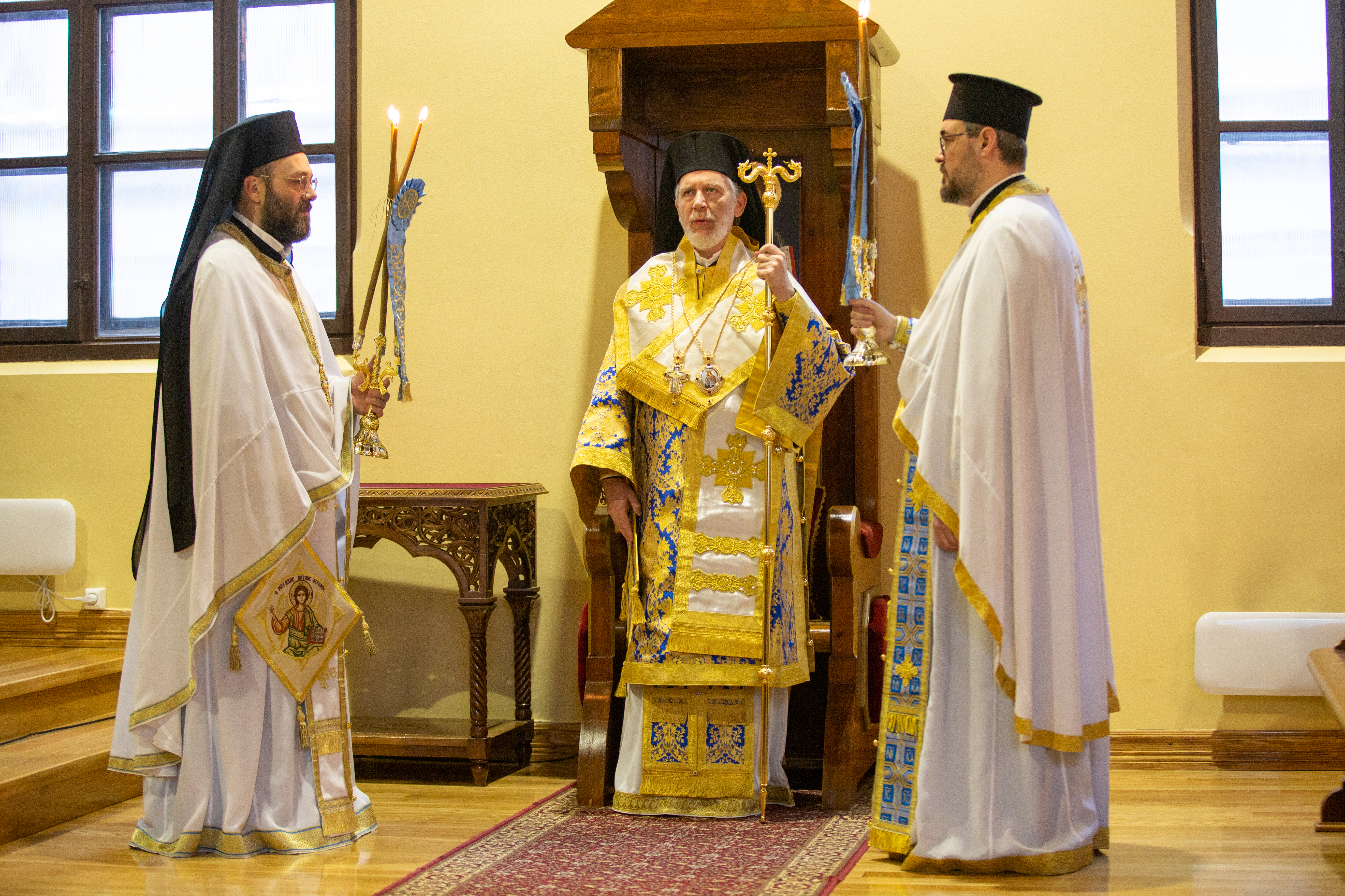 Iconographers Messrs. Michail Androutsos, Demetrios Androutsos, and Spyridon Metsis worked on the installation of the first icon frescoes inside the Holy Altar of the Metropolitan Church. Specifically, they installed the Theotokos seated at a throne, circular icons featuring sis prophets, the Holy Eucharist, and Christ Enthroned, surrounded by eight hierarchs.