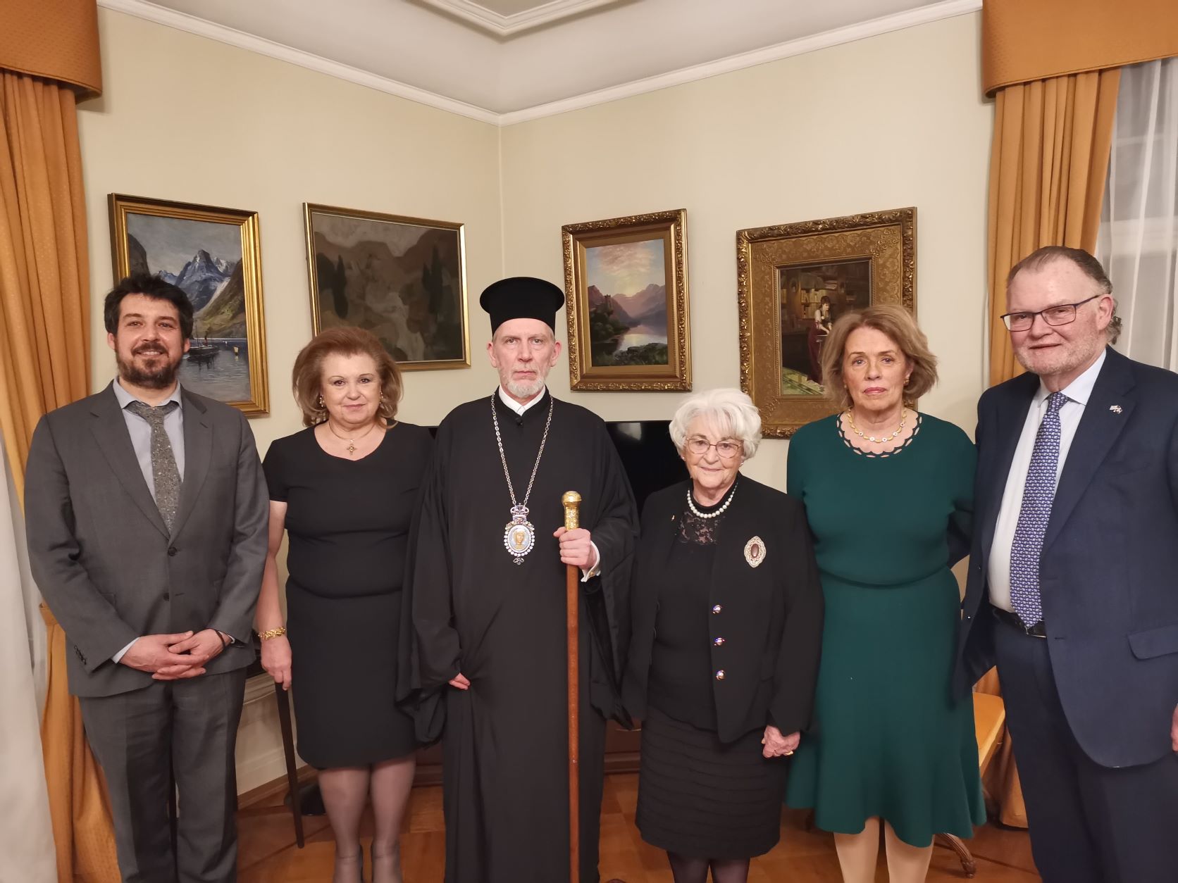 In his sermon, Metropolitan Cleopas spoke about the importance of the Theotokos’ role in safeguarding Christ during His infancy, Whom she bore as a “cockle housing the divine pearl.” He also wished all those present to experience “good tidings” throughout their life by spreading the Gospel in word and deed.Afterward, the Metropolitan attended a dinner hosted by Her Excellency Ms. Anna Korka, Ambassador of Greece to Norway, at the embassy residence. He was joined by Fr. Alexander Loukatos, the Honorable Messrs. Konstantinos Danassis, Charge d’Affaires at the Greek Embassy in Oslo and Mr. Lambros Kokkonos, Director of the Consulate office, the Honorable Mr. Rafn Alexander Sigurdsson, Honorary Consul of Greece in Iceland, together with his wife Ms. Anna Juliana Sveinsdottir, and Ms. Angeliki Kruse Jensen, a longtime member of the Greek Community in Oslo.Speaking at the gathering, Metropolitan Cleopas thanked Ambassador Korka for her warm hospitality, collaboration, and the support offered by her and her colleagues to the ministry of the local Church and Greek Community in Norway, while also conveying the heartfelt paternal wishes of His All-Holiness Ecumenical Patriarch Bartholomew.The next day, the feast of the Theotokos celebrating the Annunciation by the Archangel Gabriel that she would give birth to Christ, Metropolitan Cleopas presided over the Archieratical Divine Liturgy at the Metropolitan Church in Oslo, assisted by the parish priests of the church. At the end of the service, a blessing of the loaves and doxology service for the national holiday was held.The liturgical gathering was celebrated in Greek, Norwegian, English, and French. The festal hymns of the service, which was streamed live on the Facebook page of the Holy Metropolis of Sweden, were chanted by the Head Changer of the Metropolitan Church Mr. Panagiotis Katsivalis, who was assisted by Messrs. Kosmas Plakou and Erik Porfyrios Hasner. Messrs. Konstantinos Sidiropoulos and Halle Theologos Bakken assisted inside the Holy Altar.The Divine Liturgy was attended by Ambassador Korka, Messrs. Danassis and Kokkonos, the Sigurdssons, the President of the Hellenic Society of Norway Mr. Ioannis Aliferis, the President of the Greek School in Oslo PTA Mr. Valentino Kongezos, the parish council members of the Metropolitan Church, and a large number of faithful.Ambassador Korka delivered an address celebrating the holiday, while Metropolitan Cleopas thanked her and her associates for the hospitality they extended to him at the Ambassador’s residence and their honorary presence at the Metropolitan Church, as well as Mr. Sigurdsson and his wife for the invaluable support they provide to the ministry of the Parish of St. Bartholomew the Apostle in Reykjavik.The Metropolitan offered the parish priests of the Metropolitan Church Fr. Alexander and Fr. Maxime an artophorion (tabernacle) to adorn the Holy Altar of their newly renovated church, which also features newly written iconography. Additionally, he offered gifts to Ms. Kyriaki Papadopoulou Samuelsen, a parish council member and legal overseer of the Metropolitan Church, and the Sigurdsson family for their longstanding labor of love to the parishes of Oslo and Reykjavik, respectively.Afterwards, a holiday concert was offered by the music ensemble of the St. George Cathedral youth in Stockholm, 12 of whose members traveled to Oslo to offer a musical tribute and convey their holiday greetings to the members of the parish of the “Theotokos of the North.” There, they also had the opportunity to interact with the corresponding youth association of the Metropolitan Church in Oslo. The celebrations were concluded with a luncheon at the Metropolitan Church community hall, hosted by the local parish Ladies Philoptochos Society and Mr. Ion Pascal.That afternoon, the Metropolitan returned to his eparchy’s see in Stockholm.The next day, Sunday March 26, 2023, Metropolitan Cleopas presided over the Archieratical Divine Liturgy at the St. George Cathedral in Stockholm, assisted by the parish priest of the Cathedral, the Very Rev. Fr. Bartholomew Iatridis. The hymns of the feast were chanted by Dr. Andreas Selamsis, Dr. Georgios Sidiras, Mr. Ilias Gergis, and Ms. Iliana Antoniou.The Divine Liturgy was attended by Their Excellencies Greece’s Ambassador to Sweden Mr. Andreas Fryganas and Cyprus’ Ambassador to Sweden Mr. Solon Savvas, together with their associates, the President of the Greek School of Stockholm PTA Mr. Demetrios Siotis and his family, students and parents from the Greek School, as well as members of the Lykeion ton Ellinidon women’s association chapters in Stockholm, Ikaria, and Katerini, Greece.Dr. Nicholas Divinis and Ambassador Fryganas offered the celebratory speeches of the day. In his sermon, the Metropolitan spoke about the seminal and timeless messages arising from the feast of the Annunciation and Greek Independence. He also thanked the speakers of the day, as well as the children from the Hellenic School and parish’s Sunday School, in addition to visitors from Greece and members of the Lydeion ton Ellinidon from Ikaria and Katerini.Metropolitan Cleopas offered a copy of the Metropolis’ publication chronicling the Patriarchal Visit to Stockholm as a token of appreciation to Dr. Divinis, Ms. Evgenia Noidou, former Director of the Greek Afternoon School of the Boston Cathedral, the President of the Lykeion to Ellinidon’s chapter in Katerini Ms. Polytimi Stamatopoulou Papakosta, and its representative from Ikaria.A reception followed at the Museum of Hellenic Christian Heritage on site at the Cathedral, courtesy of the Lykeion ton Ellinidon’s Stockholm chapter and Mr. Angelos Exadaktylos.Photo credit: Holy Metropolis of Sweden, Fr. Bartholomew Iatridis, Fr. Alexander Loukatos, & Mr. Mike Bikoulis.