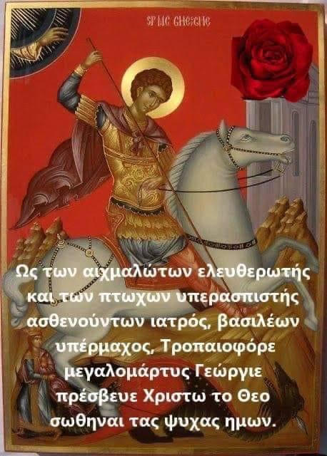 Ὡς τῶν αἰχμαλώτων ἐλευθερωτής, καὶ τῶν πτωχῶν ὑπερασπιστής, ἀσθενούντων ἰατρός, βασιλέων ὑπέρμαχος, Τροπαιοφόρε Μεγαλομάρτυς Γεώργιε, πρέσβευε Χριστῷ τῷ Θεῷ, σωθῆναι τὰς ψυχὰς ἡμῶν.