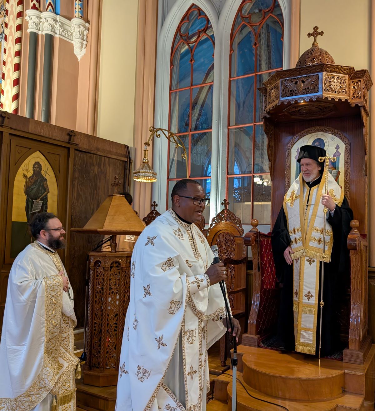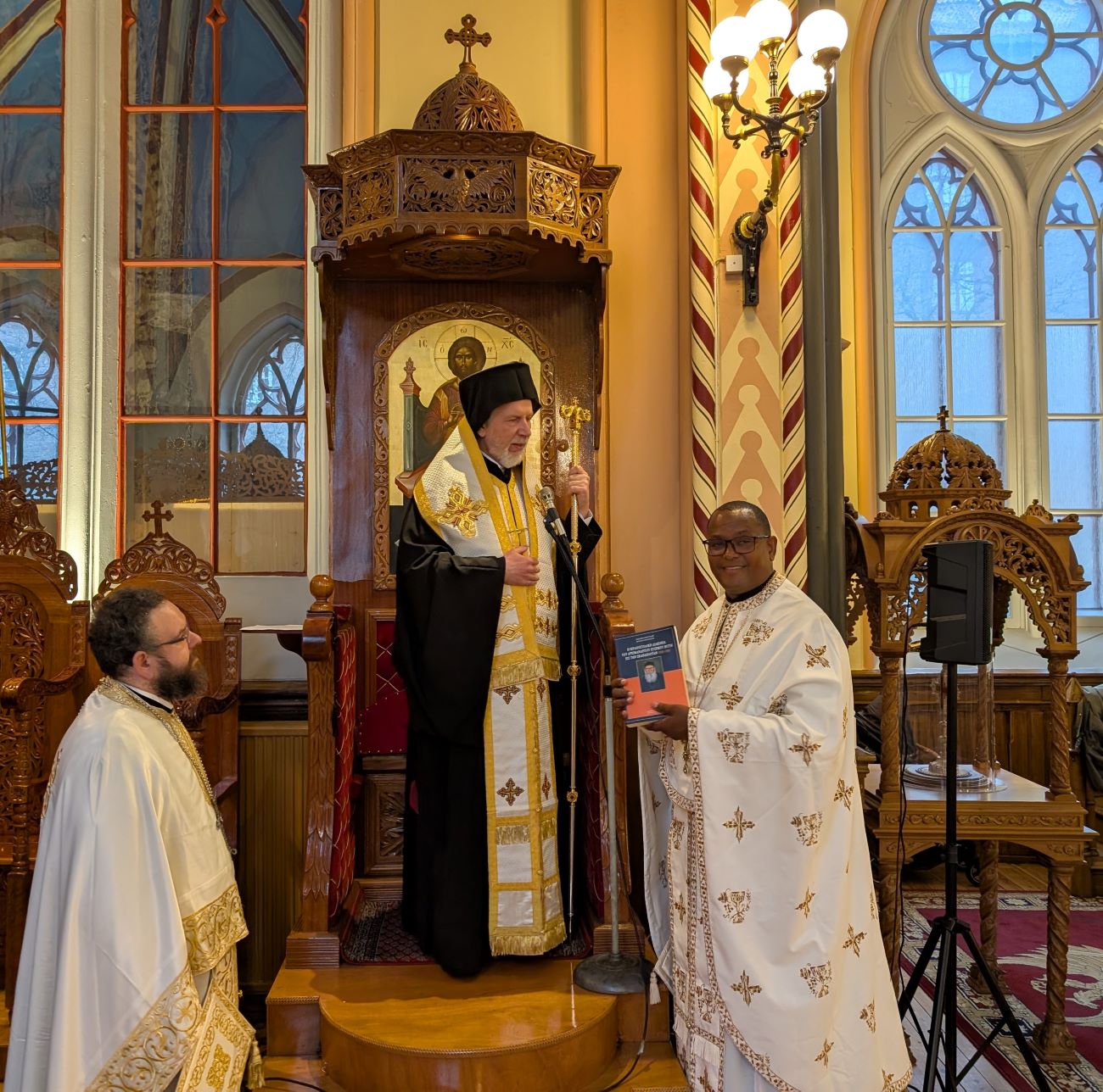 Ο Σεβ. Ποιμενάρχης, αφού κήρυξε τον θείο λόγο στην Ελληνική και Αγγλική γλώσσα, αναφερθείς στην Ευαγγελική περικοπή της ημέρας, στο τέλος καλωσόρισε τον π. Ευάγγελο, υπογραμμίσας την αρτία γνώση του τυπικού της Εκκλησίας και την θεολογική του κατάρτιση, ενώ, αφού επεσήμανε την μακροχρόνια γνωριμία του με τον Σεβ. Ποιμενάρχη του, Σεβ. Μητροπολίτη Ναϊρόμπι κ. Μακάριο, τον παρεκάλεσε, να του επιδώσει την εσχάτως εκδοθείσα μελέτη του από την Αποστολική Διακονία της Εκκλησίας της Ελλάδος, με τίτλο: «Η ιεραποστολική Διακονία του Αρχιμανδρίτου Ευσεβίου Βίττη εις την Σκανδιναυΐαν 1965-1980».