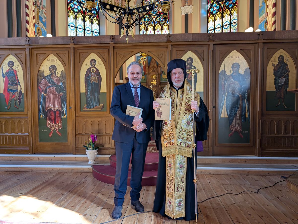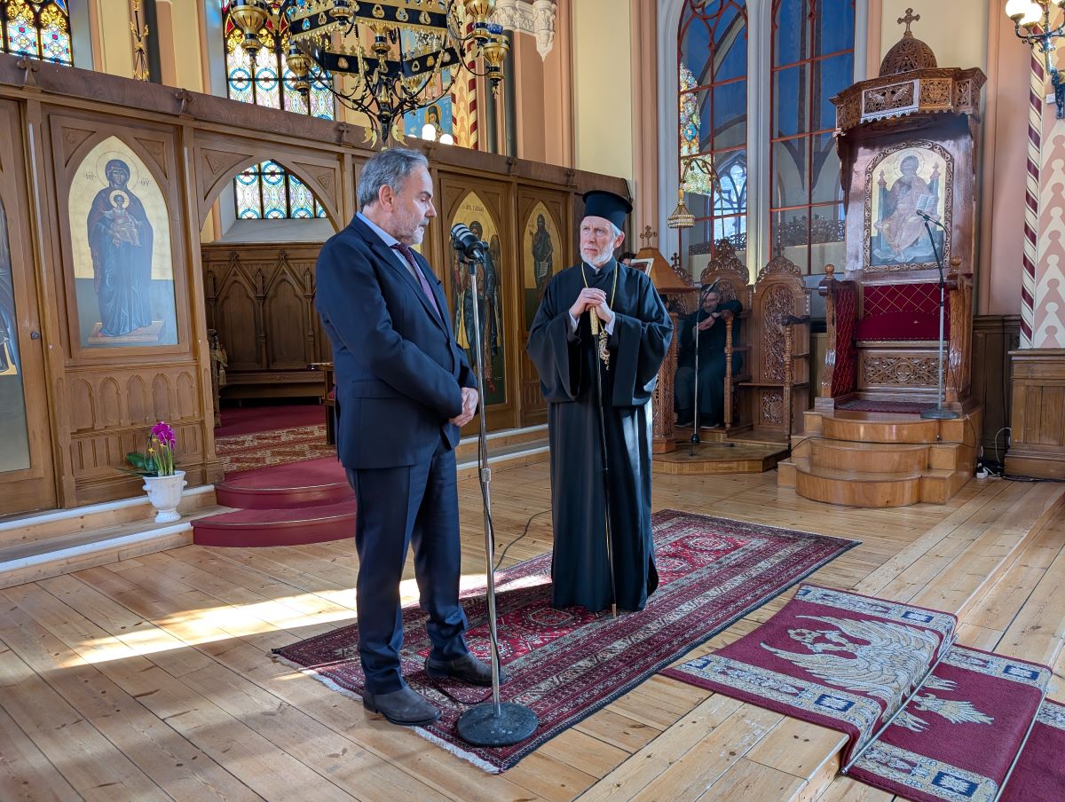 Κατακλείσας, καλωσόρισε και παρουσίασε τους εκκλησιασθέντες εξ Ελλάδος, Ελλογιμ. κ. Γεώργιο Πηλιχό, συγγραφέα της μελέτης: «Άουσβιτς: Έλληνες-Αριθμός Μελλοθανάτου», καθώς και τους συνοδούς του, Εντιμ. κ. Εμμανουήλ Τουφεξή, Διευθυντή του Φιλανθρωπικού Οργανισμού Agape, και την συνεργάτιδά του Ευγεν. κ. Γεωργία Καρασαββίδου, εκ Θεσσαλονίκης, καθώς και τους δικηγόρους εξ Αθηνών κ.κ. Κωνσταντίνο και Δημήτριο Σφακιανάκη.