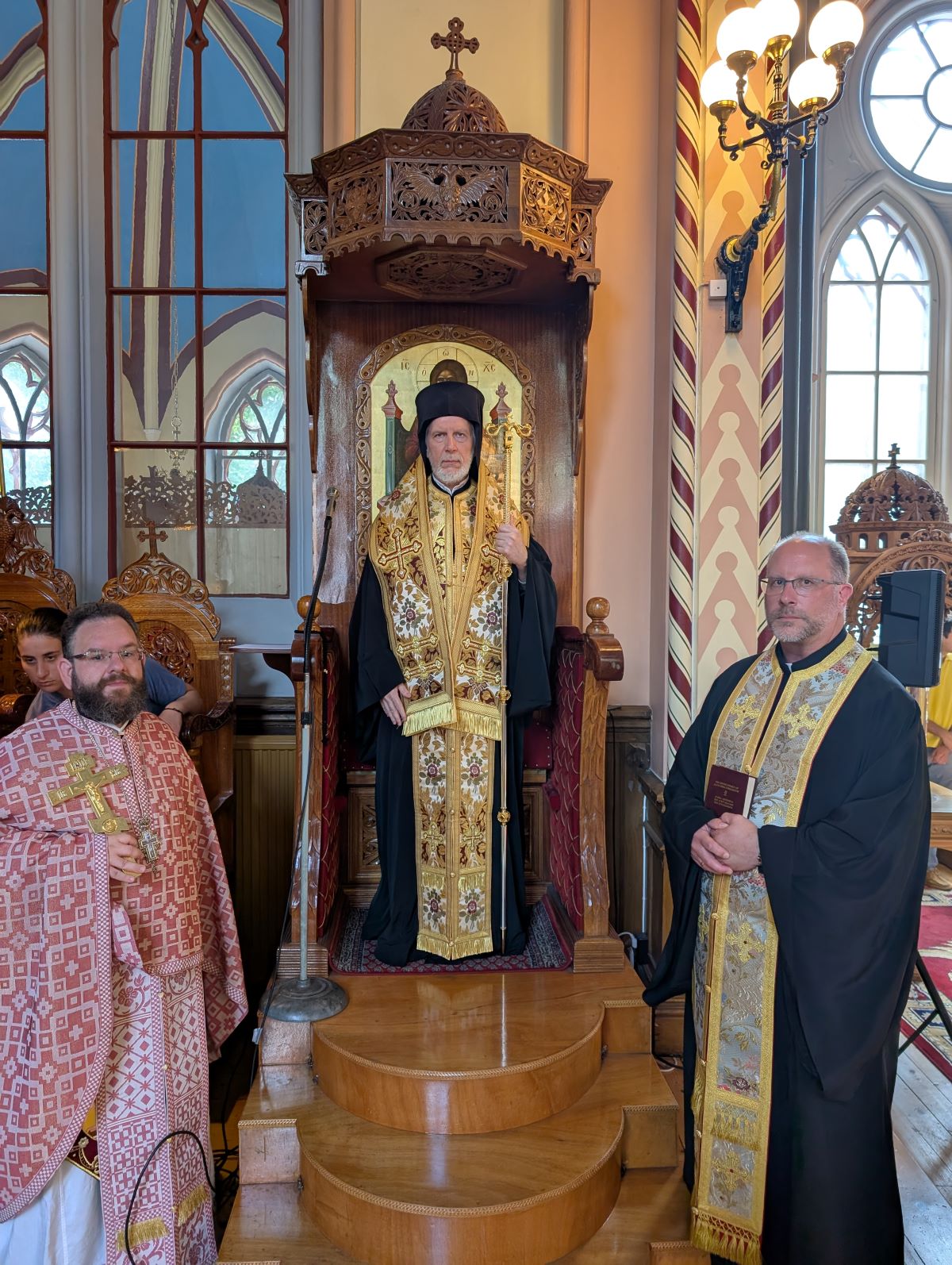 Μετά την απόλυση της Θείας Λειτουργίας και πριν την έναρξη του θείου κηρύγματος, ο Ποιμενάρχης καλωσόρισε τον παλαιό συμφοιτητή του, από την περίοδο των μεταπτυχιακών του σπουδών στην Θεολογική Σχολή Τιμίου Σταυρού Βοστώνης, συνοδευόμενο από την Πρεσβυτέρα του Στεφανία, καθώς και το φιλικό τους ζεύγος από την Νέα Υερσέη Ευστάθιο και Καλιρρόη, στους οποίους μαζί με τις ευχαριστίες για την τιμητική τους επίσκεψη επέδωσε την τρίγλωσση έκδοση της Θείας Λειτουργίας από την Ι. Μητρόπολη στην Ελληνική, Αγγλική και Σουηδική γλώσσα, και η οποία τυπώθηκε ευγενώς από την Αποστολική Διακονία της Εκκλησίας της Ελλάδος, με την μέριμνα και συμπαράσταση του Πανιερωτάτου Μητροπολίτου Φαναρίου κ. Αγαθαγγέλου, του και Γενικού Διευθυντού του μνημονευθέντος Εκκλησιαστικού Οργανισμού.