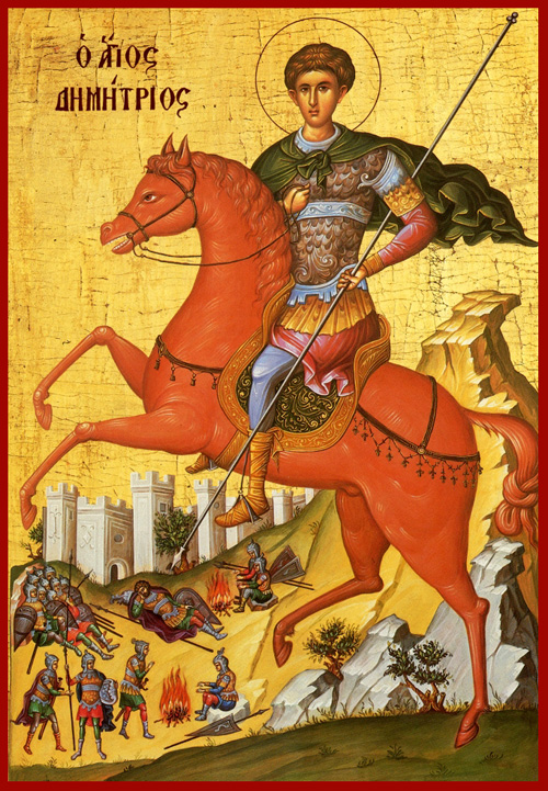 “Φύλαττε τους δούλους σου αθλητά, μάρτυς μυροβλύτα τους τιμώντάς σε ευσεβώς, και ρύσαι κινδύνων και πάσης άλλης βλάβης, Δημήτριε τρισμάκαρ ταις ικεσίαις σου”. (Μεγαλυνάριον).