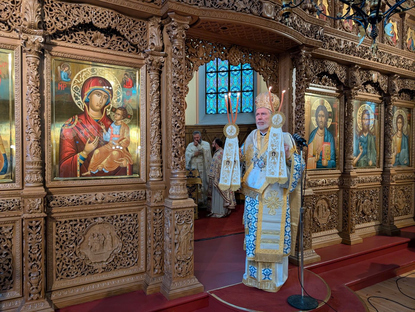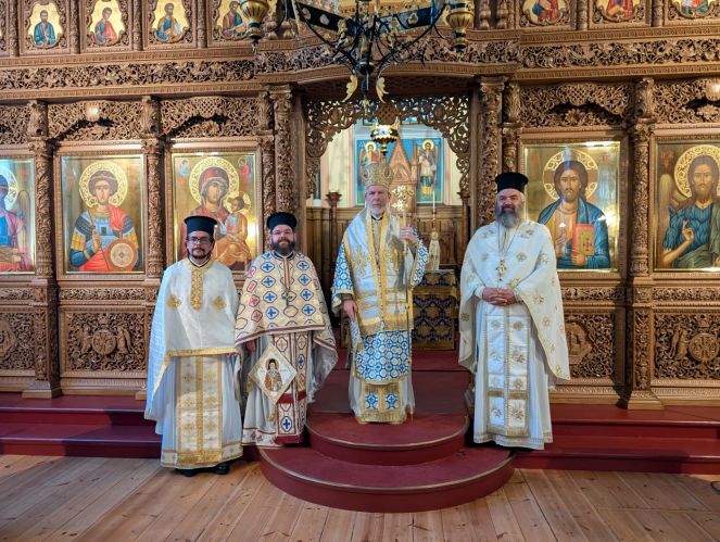 Serving together with the Shepherd of the Scandinavian Lands were the Very Reverend Archimandrite Bartholomew Iatridis, Pastor of the Cathedral, as well as visiting clergy: the Reverend Hieromonk Hieronymos (José Quintero) of the Holy Metropolis of Mexico, and the Reverend Protopresbyter Nectarios from Syria, a clergyman of the Holy Metropolis of Nea Krini and Kalamaria.