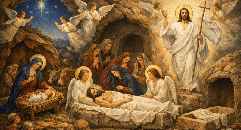 Η φάτνη, το σινδόνι και ο κενός Τάφος δεν είναι τρεις εικόνες· είναι μία αλήθεια, μία ενιαία σωτηριολογική πορεία. Ο Χριστός γεννάται, για να πεθάνει εκουσίως και πεθαίνει για να αναστήσει τον άνθρωπο.